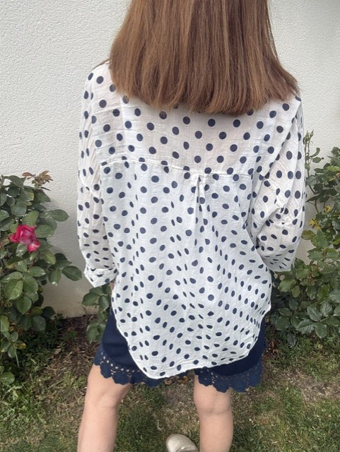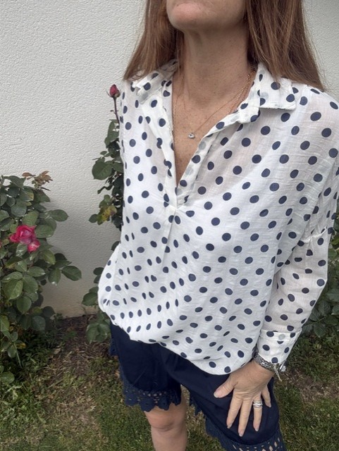 - Détails : blouse en voile de coton, manches longues, motif pois tendance, coupe fluide.