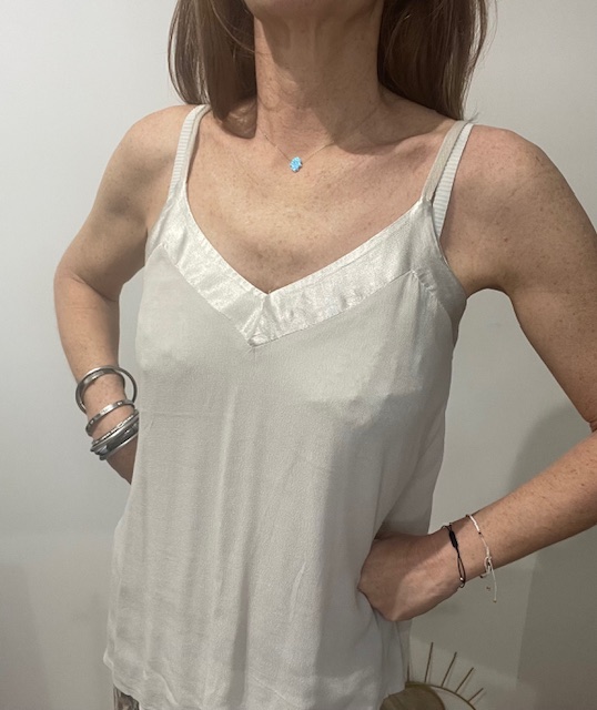 - Détails : Top caraco à bretelles fines, élastique au dos, réglable, encolure V satiné, tissu fluide et doux